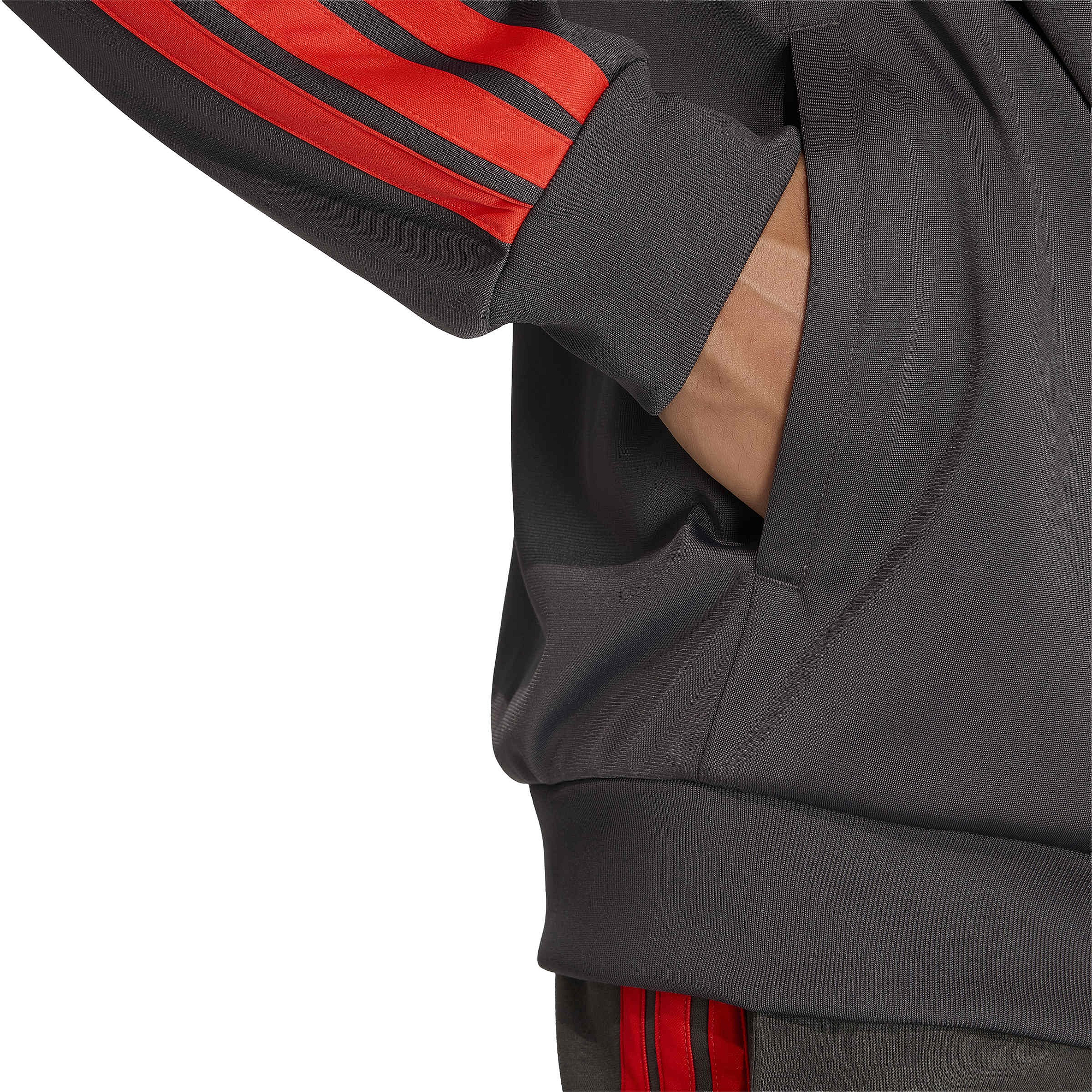 Veste d’entraînement noir-gris en tricot avec col montant et coupe regular. Fermeture zippée sur toute la longueur, bords côtelés et poches latérales. Logo Audi F1® Team à gauche sur la poitrine, logo adidas Performance à droite, 3-Stripes sur les manches et bande adidas Motorsport au col. En 100 % polyester recyclé. Lavable à 30°C, adapté au sèche-linge.