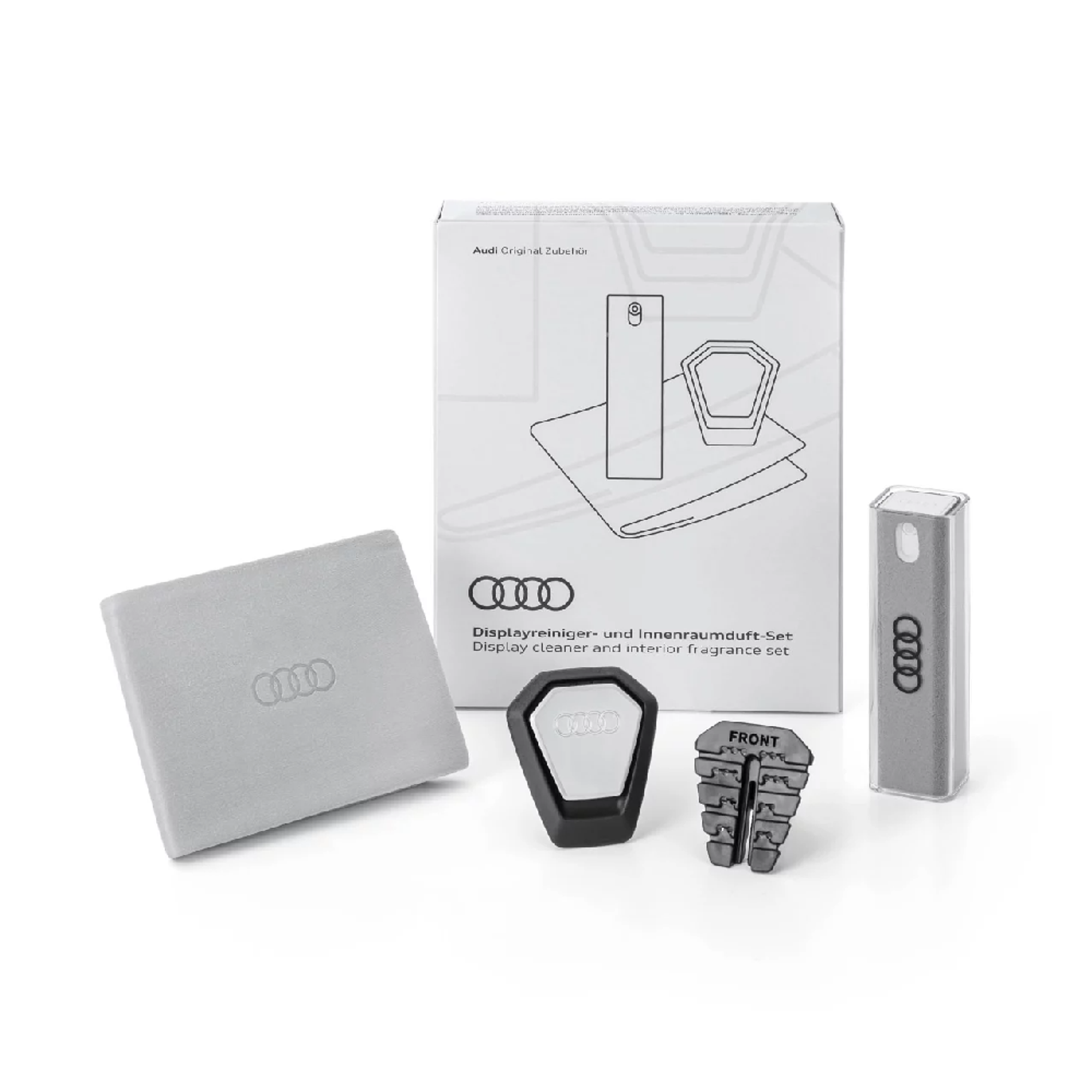 La boîte contient un chiffon de nettoyage pour écrans tactiles, un nettoyant pour écran 2 en 1 gris et un désodorisant Audi Singleframe noir plus 1 bâtonnet de parfum.