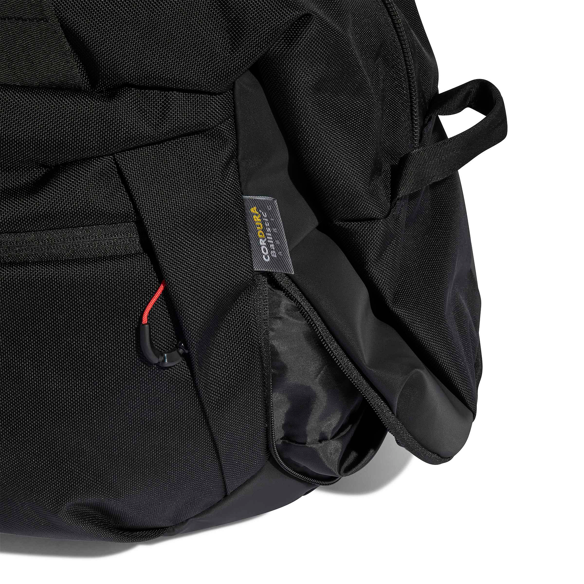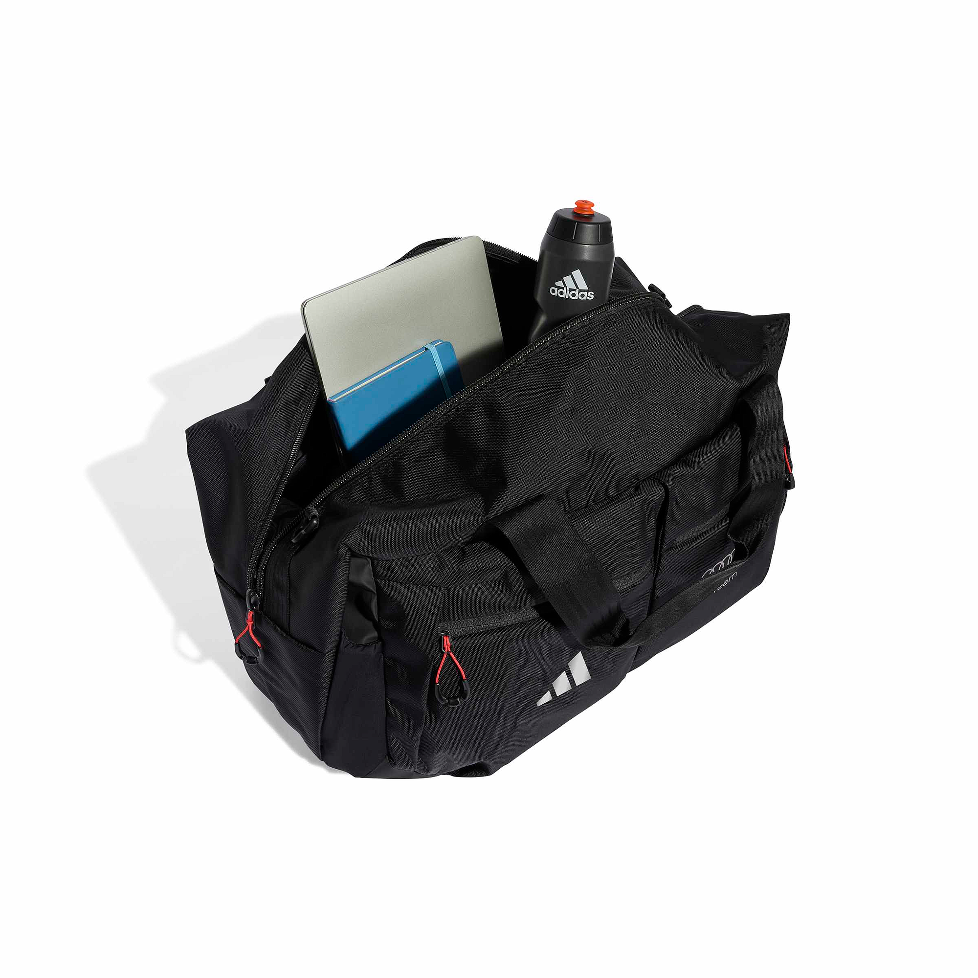 Zwarte, robuuste reistas met brede opening, binnenvak, groot ritsvak aan de achterkant, twee ritsvakken aan de buitenkant en extern schoenenvak. Voorzien van gewatteerde schouder- en draagbanden met Loadspring-technologie. Met Audi F1® Team- en adidas Performance-logo’s. Afmetingen: 57 × 27 × 33 cm. Gemaakt van gerecycled polyamide (CORDURA®).