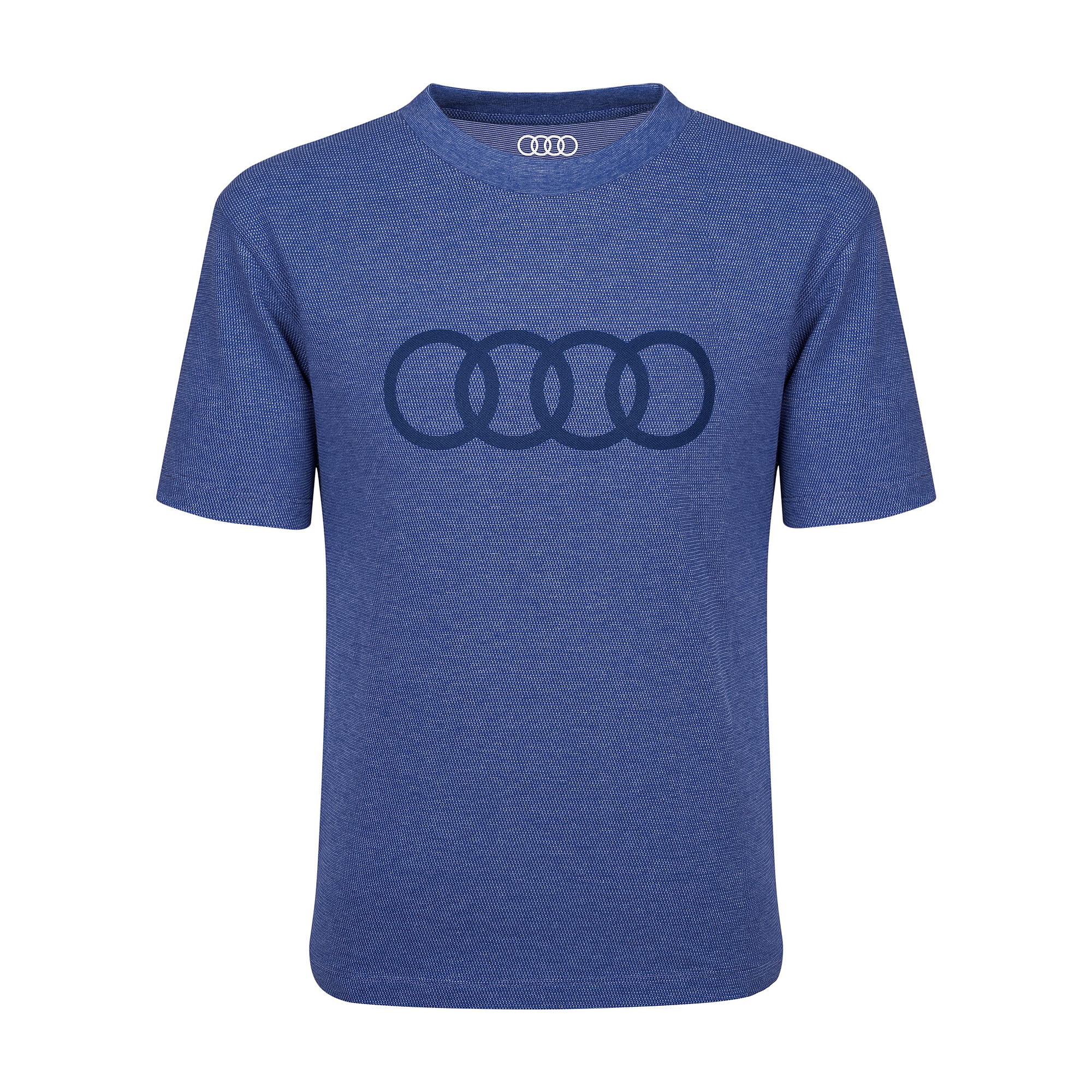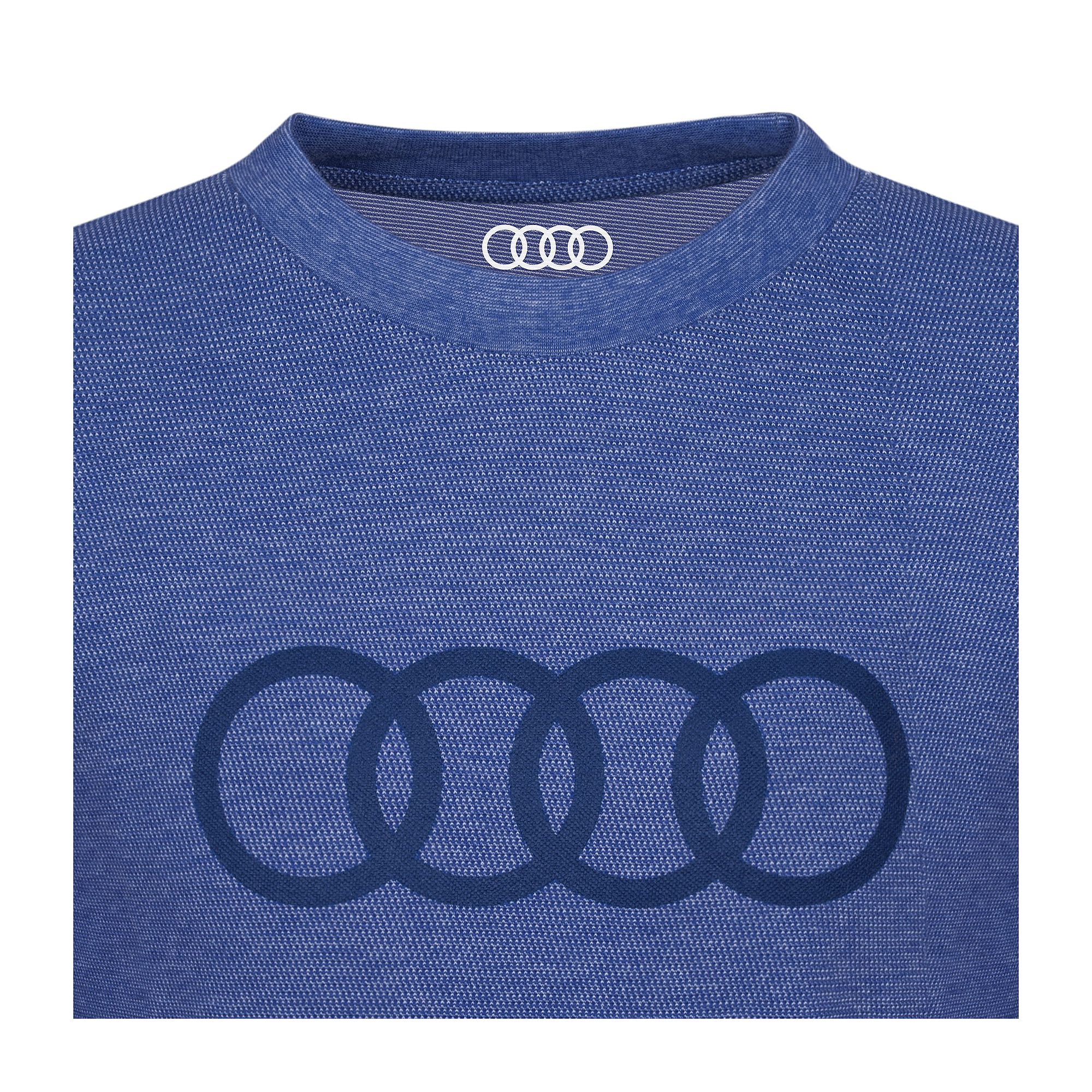 Details: - T-shirt met ronde hals - Brede boord bij de hals Branding: - Grote Audi-ringenprint op het voorpand - Audi-ringenprint in de nek Materiaal: 100% katoen Wasvoorschriften: - Machinewas op 30 °C - Niet geschikt voor de droger Kleur: Blauw
