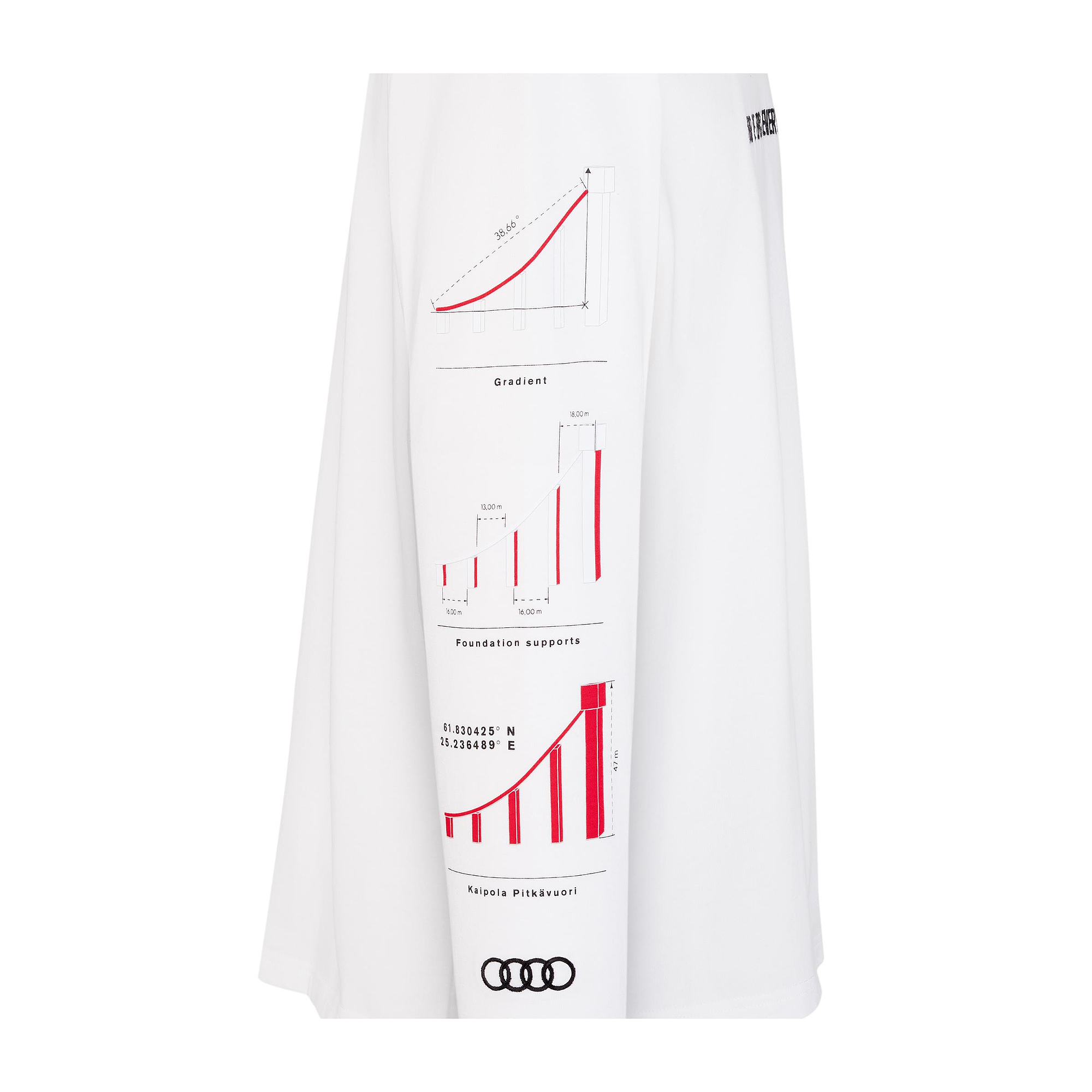 Details: Moderne unisex longsleeve (iets oversized) met manchetten. Merk: Borduursel 'For the Epic or Everyday' op de voorkant - Opdrukmotief 'Technische gegevens skischans Kaipola' en Audi-ringen op de rechtermouw - Quattro-badge in de nek - Audi-ringen in de nek Materiaal: 100% katoen (stevigere shirtstof). Wasvoorschriften: Machinewas 30°C - Niet in de droger. Kleur: wit