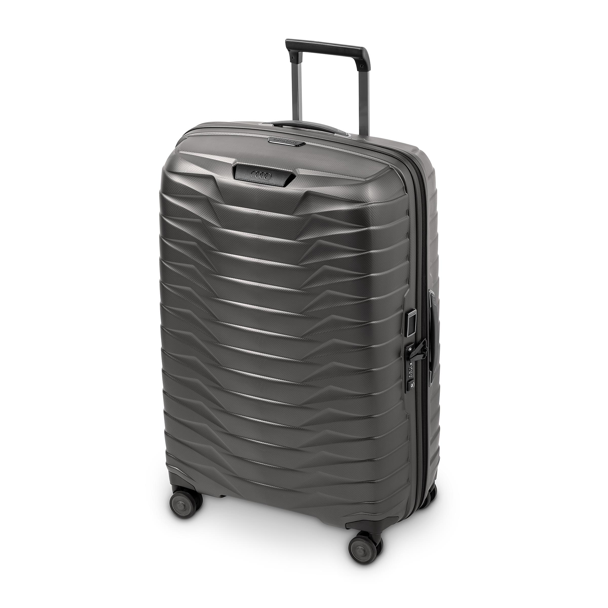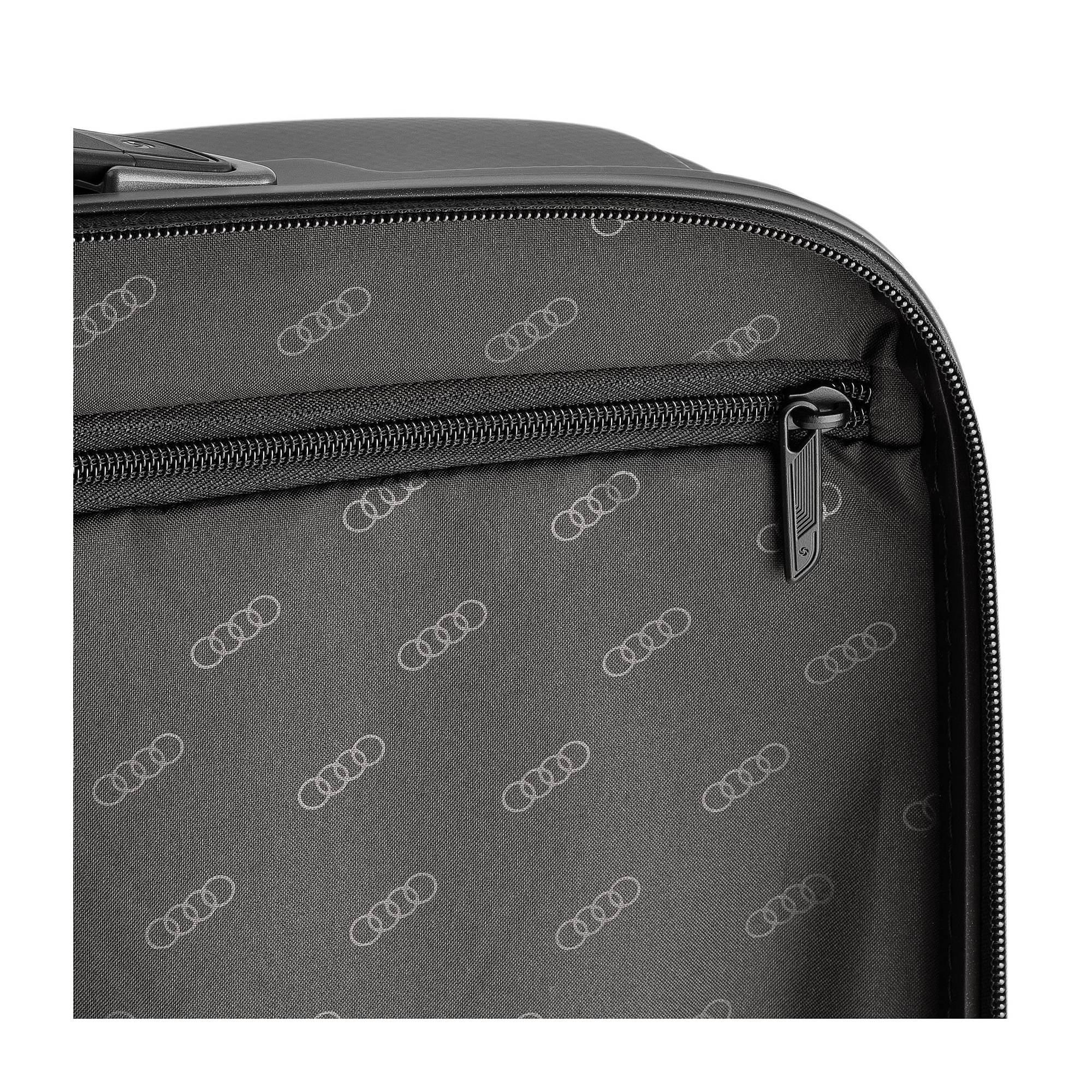 Details: - Lichtgewicht hardcase reiskoffer in handbagageformaat vervaardigd uit Roxkin™, een exclusief materiaal met meerdere lagen - Tweewegrits rondom - Vier geluidarme dubbele zwenkwielen, 360° draaibaar - Uitschuifbare dubbele trekstang - TSA-combinatieslot - Boven- en zijhandgreep - Uittrekbaar adreslabel - Exclusieve branding met Audi-ringen, co-branding met Samsonite - Ontwikkeld in samenwerking met de fabrikant Samsonite - Gemaakt in Europa - 10 jaar fabrieksgarantie, WeCare-programma Binnenkant: - Exclusieve Audi-voering - Onderste compartiment met tussenschot en verwijderbare, in hoogte verstelbare gekruiste inpakriemen - Bovenste compartiment met tussenschot en extra ritsvak Branding: - Plaatje met exclusief Audi-ringenlogo - Plaatje met Samsonite-logo - Voering met Audi-ringen Afmetingen / volume / gewicht: - 75 x 51 x 31 cm / 98 l / 3,1 kg Materiaal: - Buitenkant: polypropyleen - Binnenkant: gerecycleerd polyester van petflessen Kleur: Matgrafiet met zwarte accenten