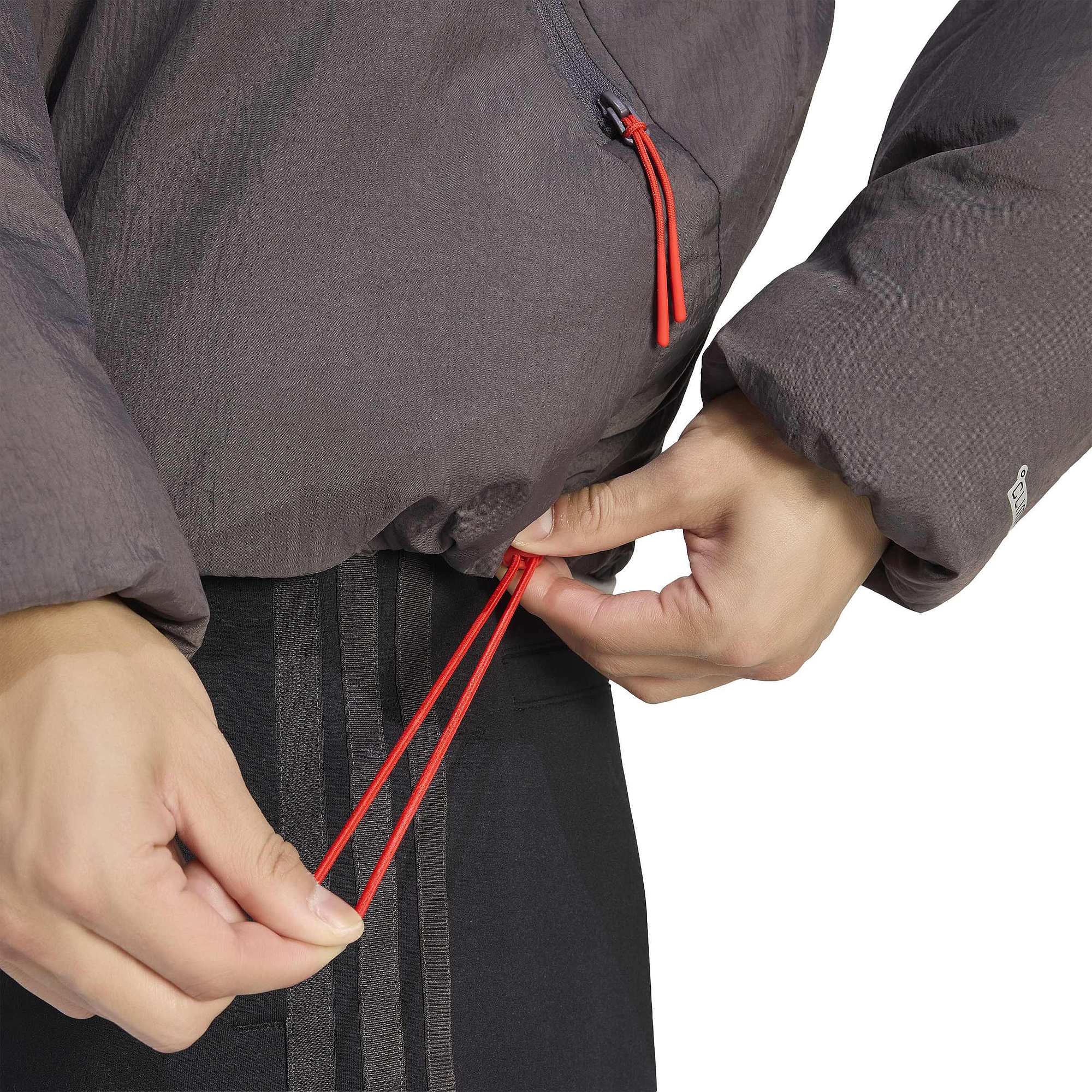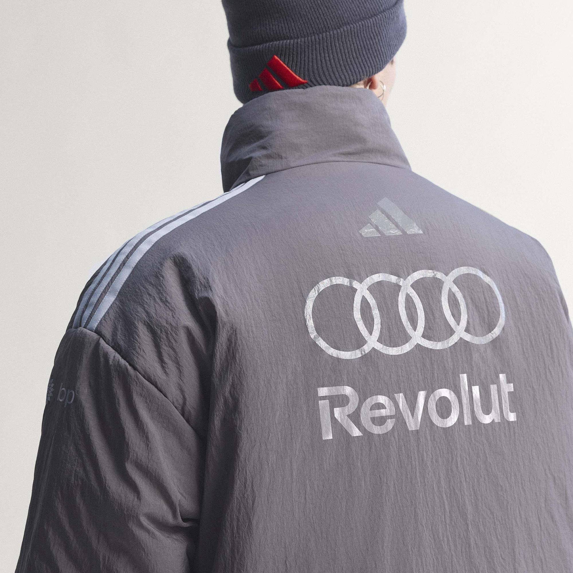 Lichtgewicht gevoerde grijze jas met opstaande kraag en losse pasvorm. Voorzien van volledige rits, zijritszakken, binnenzak met drukknop en verstelbare zoom. Gemaakt van polyamide met Climawarm-technologie. Met Audi-ringen en Revolut-logo links op de borst, adidas Performance-logo rechts en op de hals, grote logo’s op de rug, sponsorlogo’s op de mouwen en 3-Stripes op de schouders. Wasbaar op 30°C, geschikt voor de droger.