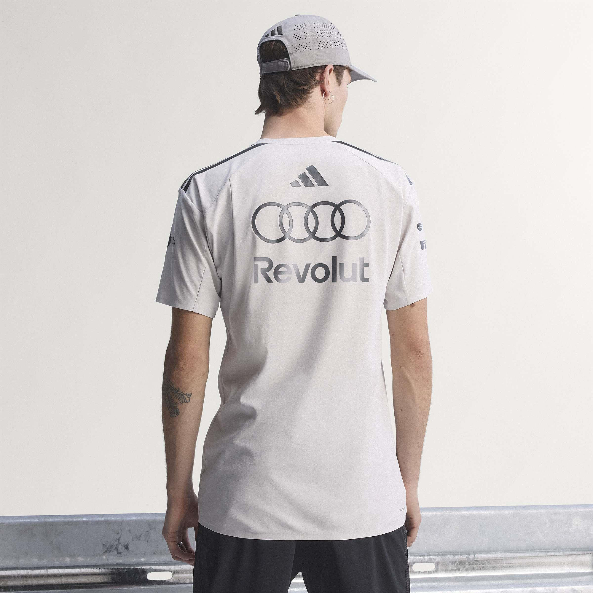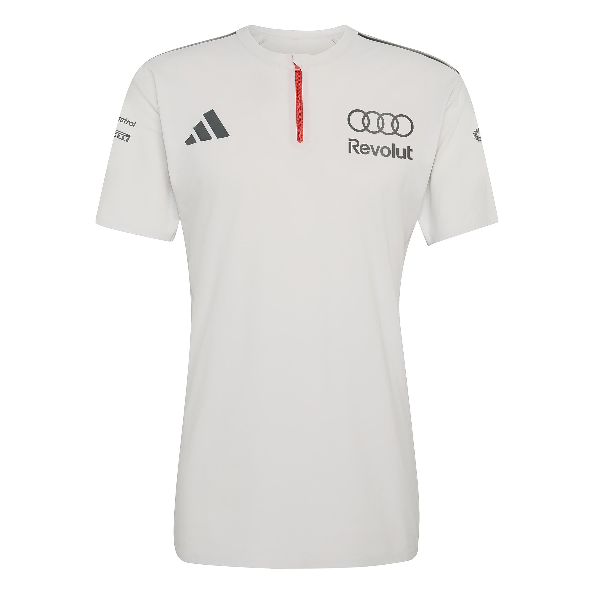 Witte polo met ronde hals en rits, slim fit van fijne piqué met Climacool-technologie. Naadloze rits met kinbescherming. Met Audi-ringen en Revolut-logo links, adidas Performance-logo rechts, sponsorlogo’s op de mouwen en 3-Stripes op de schouders. Gemaakt van 57% gerecycled polyamide en 43% polyester (22% gerecycled). Wasbaar op 40°C, niet geschikt voor de droger.