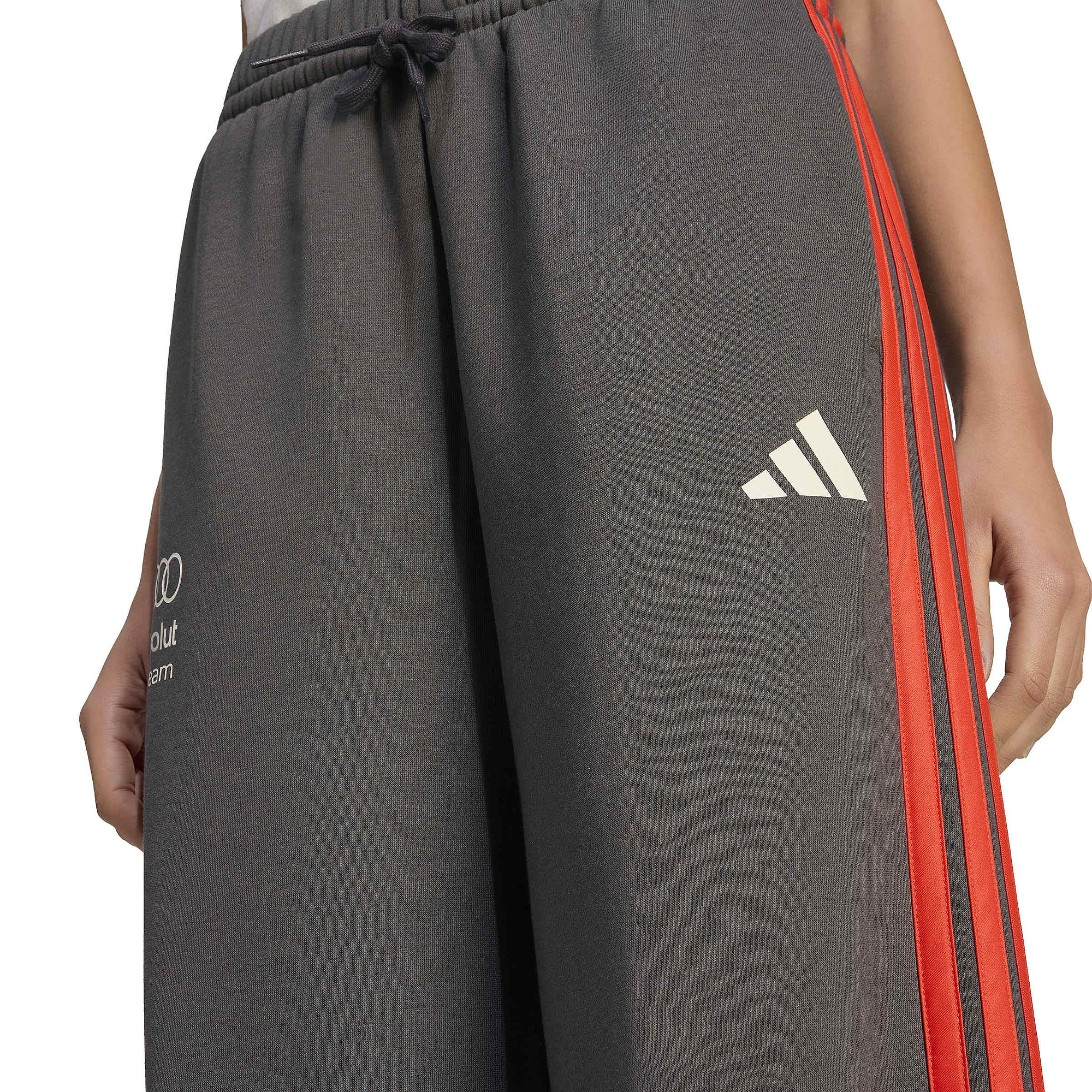Zwart-grijze lange joggingbroek met wijde pasvorm, elastische taille met trekkoord en zijzakken. Voorzien van Audi F1® Team- en adidas Performance-logo vooraan en 3-Stripes aan beide zijden. Gemaakt van 55% katoen, 36% gerecycled polyester en 9% viscose. Wasbaar op 40°C, geschikt voor de droger.
